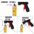 - Hold the front of the spray tool with your right hand and push the can horizontally into the spray tool.