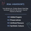 - مكونات حقيقية: لحم تونة كامل، صدر دجاج، بيض مجفف، زيت بذور دوار الشمس، مستخلص السمك، التورين، الفيتامينات والمعادن