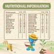 - المكونات: دقيق القمح، مواد صلبة حليب منزوعة الدسم، سكروز، عسل، أولين النخيل، زيت بذور اللفت قليل الإيروسيك، زيت جوز الهند، زيت دوار الشمس، نكهة صناعية (فانيليا)، بيفيدوس، معادن وفيتامينات.